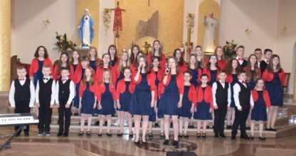 2022-04-27 Chóry z GOK śpiewem wypraszały miłosierdzie dla Polski i świata 24 kwietnia 2022 roku w Niedzielę Bożego Miłosierdzia, zespolone chóry dziecięce i młodzieżowe z GOK w Łukowej, pod kierunkiem p. Sławomira Kuczka, wystąpiły z repertuarem Wielkanocnym, w Sanktuarium św. Jana Pawła II w Biłgoraju