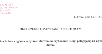 2026-01-30 OGŁOSZENIE O ZAPYTANIU OFERTOWYM Gmina Łukowa ogłasza zapytanie ofertowe na wykonanie usługi polegającej na wycince drzew. Przedmiotem zamówienia jest wycinka trzech drzew rosnących na działce gminnej nr 3693, położonej w miejscowości Łukowa, wraz z usunięciem i uporządkowaniem terenu po wykonanych pracach. Więcej informacji oraz formularz ofertowy zamieszczamy w załączeniu.