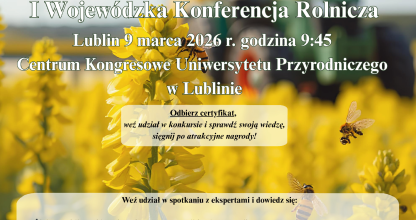 2026-02-25 Zaproszenie do udziału w Pierwszej Wojewódzkiej Konferencji Rolniczej Zapraszamy do udziału w Pierwszej Wojewódzkiej Konferencji Rolniczej „Rolnictwo Bez Ryzyka – Bezpieczne Stosowanie Środków Ochrony Roślin”, która odbędzie się 9 marca 2026 r. w Centrum Kongresowe Uniwersytetu Przyrodniczego w Lublinie. Wydarzenie organizowane jest wspólnie przez Kasę Rolniczego Ubezpieczenia Społecznego, Uniwersytet Przyrodniczy w Lublinie oraz Polskie Stowarzyszenie Ochrony Roślin. Konferencja skierowana jest nie tylko do młodzieży kształcącej się w zawodach rolniczych, ale również do rolników, producentów rolnych oraz wszystkich osób zainteresowanych tematyką bezpiecznego i odpowiedzialnego stosowania środków ochrony roślin. Jej celem jest upowszechnianie wiedzy w zakresie ochrony zdrowia, środowiska oraz minimalizowania ryzyka wypadków i zagrożeń związanych z pracą w gospodarstwie rolnym. W programie wydarzenia przewidziano m.in.: – panel ekspertów z udziałem przedstawicieli świata nauki i instytucji rolniczych, – wykłady dotyczące bezpiecznego zakupu i stosowania środków ochrony roślin, – zagadnienia związane z ochroną pszczół i środowiska, – szkolenie z zakresu prawidłowego postępowania z opakowaniami po środkach ochrony roślin oraz innymi substancjami niebezpiecznymi. Szkolenie prowadzone przez Polskie Stowarzyszenie Ochrony Roślin zakończy się wydaniem imiennych certyfikatów potwierdzających zdobytą wiedzę i kompetencje. Dodatkowo wśród uczestników konferencji zostanie przeprowadzone losowanie atrakcyjnych nagród, stanowiące element zachęcający do aktywnego udziału w wydarzeniu. Zwracam się z uprzejmą prośbą o wsparcie tej inicjatywy poprzez poinformowanie rolników z terenu Państwa gminy o organizowanym wydarzeniu oraz zachęcenie ich do udziału, m.in. za pośrednictwem strony internetowej urzędu, mediów społecznościowych, tablic ogłoszeń czy sołtysów. Udział w konferencji jest bezpłatny.