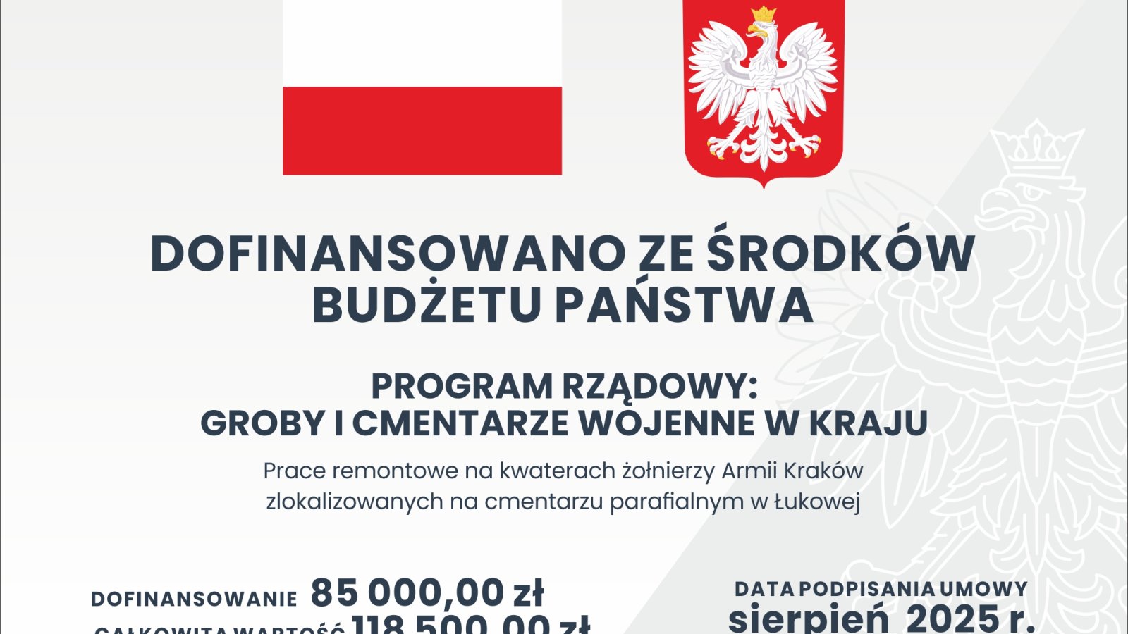 Gmina Łukowa informuje, iż rozpoczęto prace remontowe na kwaterach żołnierzy Armii Kraków zlokalizowanych na cmentarzu parafialnym w Łukowej, dofinansowane ze środków finansowych Ministra Kultury i Dziedzictwa Narodowego pochodzących z budżetu państwa w ramach Programu Rządowego: Groby i cmentarze wojenne w kraju.