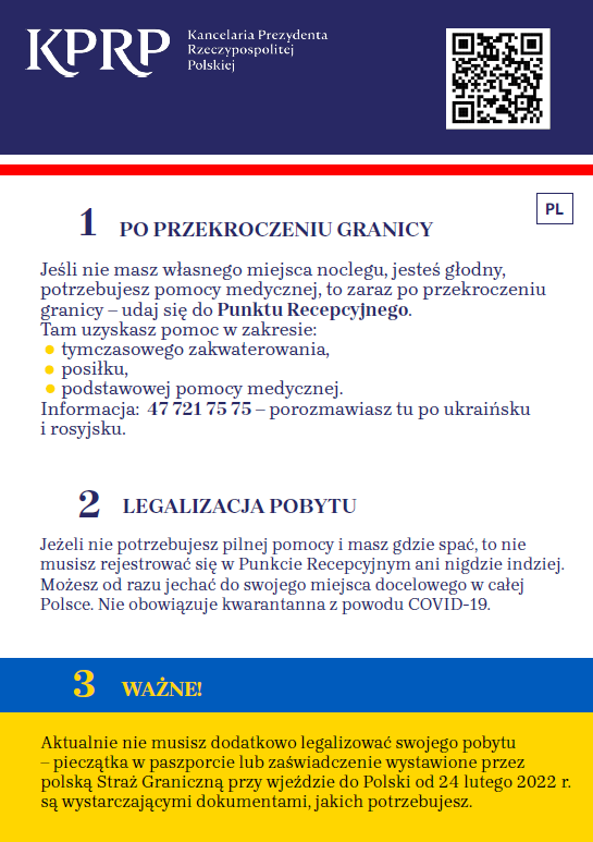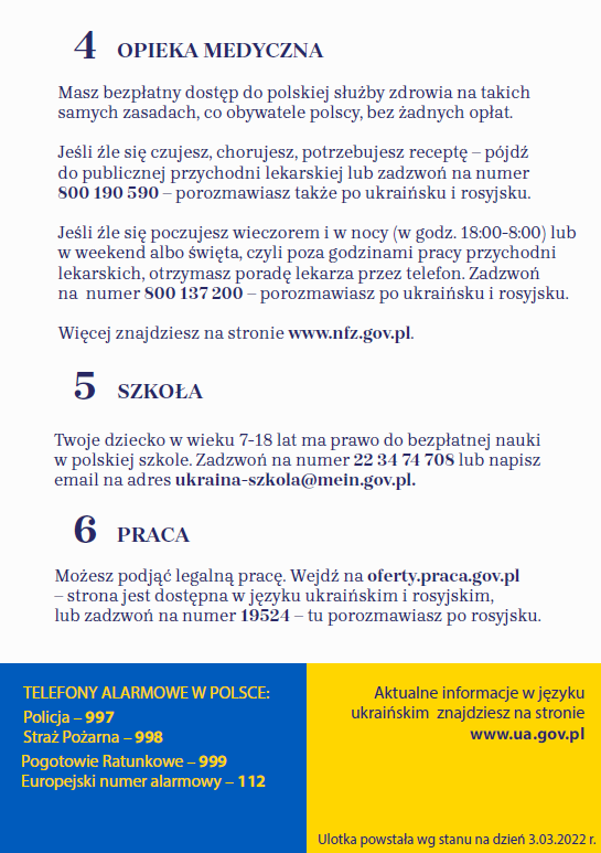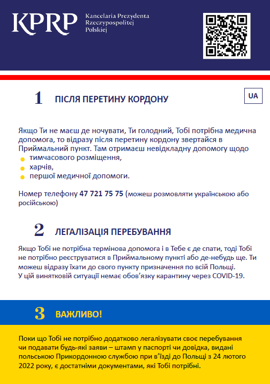 Przygotowaliśmy napisane w przystępny i czytelny sposób ulotki informacyjne dla uchodźców wojennych z Ukrainy, którzy przekroczyli granicę Polski. Ulotka ma ułatwić uchodźcom funkcjonowanie w pierwszych godzinach i dniach pobytu w naszym kraju.