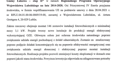 2022-05-18 INFORMACJA O REALIZACJI PROJEKTU POCHODZĄCEGO ZE ŚRODKÓW UNIJNYCH Dostawa i montaż instalacji fotowoltaicznych na terenie Gminy Łukowa Gmina Łukowa informuje, że realizuje projekt pn. „Poprawa jakości środowiska poprzez wykorzystanie odnawialnych źródeł energii szansą dla zrównoważonego rozwoju Gminy Łukowa - etap II” w ramach Regionalnego Programu Operacyjnego Województwa Lubelskiego na lata 2014-2020, Osi Priorytetowej IV Eneria przyjazna środowisku, w formie współfinansowania UE na podstawie umowy z dnia 28.04.2021 r. nr RPLU.04.01.00-06-0069/19-00, zawartej z Województwem Lubelskim, ul. Artura Grottgera 4, 20-029 Lublin. Zakres rzeczowy obejmuje montaż 146 zestawów instalacji fotowoltaicznych o minimalnej mocy 3,1 kW. Projekt tworzy nowe instalacje do produkcji energii elektrycznej wykorzystującej OZE. Głównym celem jest ochrona środowiska naturalnego poprzez zwiększenie udziału energii pochodzącej z źródeł odnawialnych. Zostanie on zrealizowany poprzez podjęcie działań koncentrujących się na poprawie efektywności energetycznej oraz zwiększenia udziału energii słonecznej i elektrycznej poprzez montaż instalacji fotowoltaicznych. Realizacja projektu pozwoli zmniejszyć koszty eksploatacji w domach oraz poprawi jakość stanu środowiska. Powyższa inwestycja odpowiada na zdiagnozowane potrzeby mieszkańców Gminy Łukowa.
