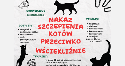 2026-01-08 Nakaz Szczepienia kotów przeciwko wściekliźnie Posiadaczom kotów w powiatach biłgorajskim, chełmskim, hrubieszowskim, krasnostawskim, tomaszowskim, zamojskim, Mieście Chełm i Mieście Zamość nakazuje się szczepienie kotów przeciwko wściekliźnie w terminie 30 dni od dnia ukończenia przez kota 3 miesiąca życia, a następnie nie rzadziej niż co 12 miesięcy od dnia ostatniego szczepienia.