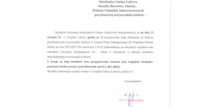 2026-01-12 Przydomowe Oczyszczalnie ścieków - informacje Mieszkańcy Gminy Łukowa - Kozaki, Borowiec, Osuchy, Kolonia Chmielek zainteresowanych przydomową oczyszczalnią ścieków. Uprzejmie informuję mieszkańców Gminy (właścicieli nieruchomości), że do dnia 23 stycznia br. w Urzędzie Gminy (pokój nr 3) przyjmowane będą deklaracje na budowę przydomowych oczyszczalni ścieków w ramach Planu Strategicznego dla Wspólnej Polityki Rolnej na lata 2023-2027 dla inwestycji 1.10.10 Infrastruktura na obszarach wiejskich oraz wdrożenie koncepcji inteligentnych wsi - obszar A Inwestycje w zakresie systemów indywidualnego oczyszczania ścieków. Z uwagi na bieg terminów oraz przygotowanie wniosku pod względem formalnoprawnym bardzo proszę o potraktowanie sprawy jako pilnej. Wszelkie informacje uzyskać można w Urzędzie Gminy Łukowa, pokój nr 3.