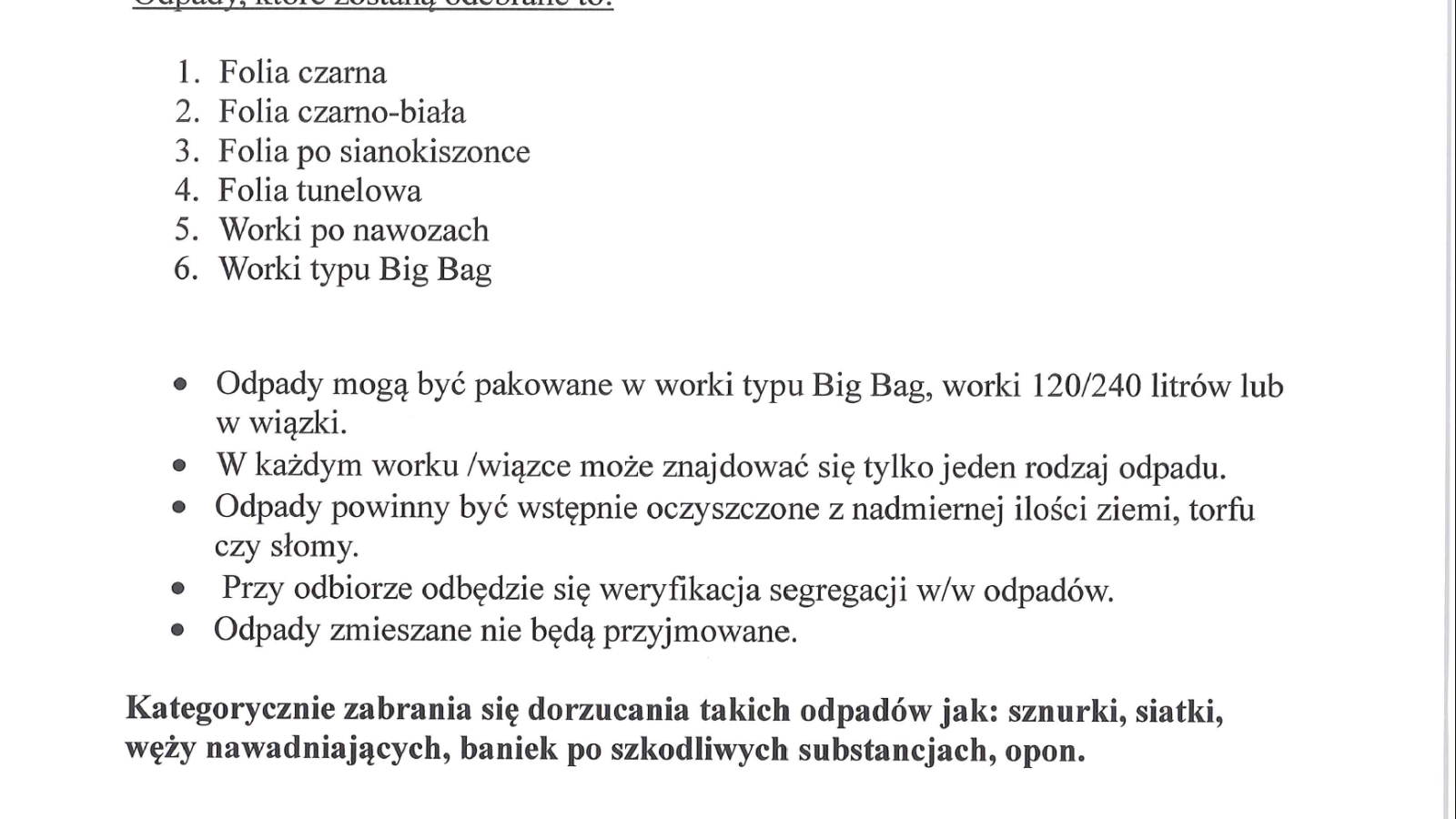 • Odpady zmieszane nie będą przyjmowane.