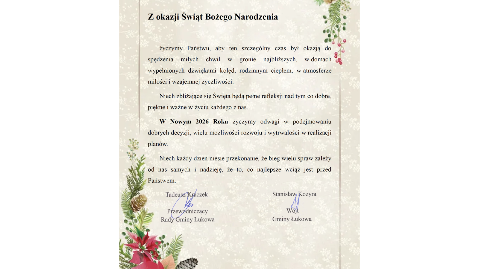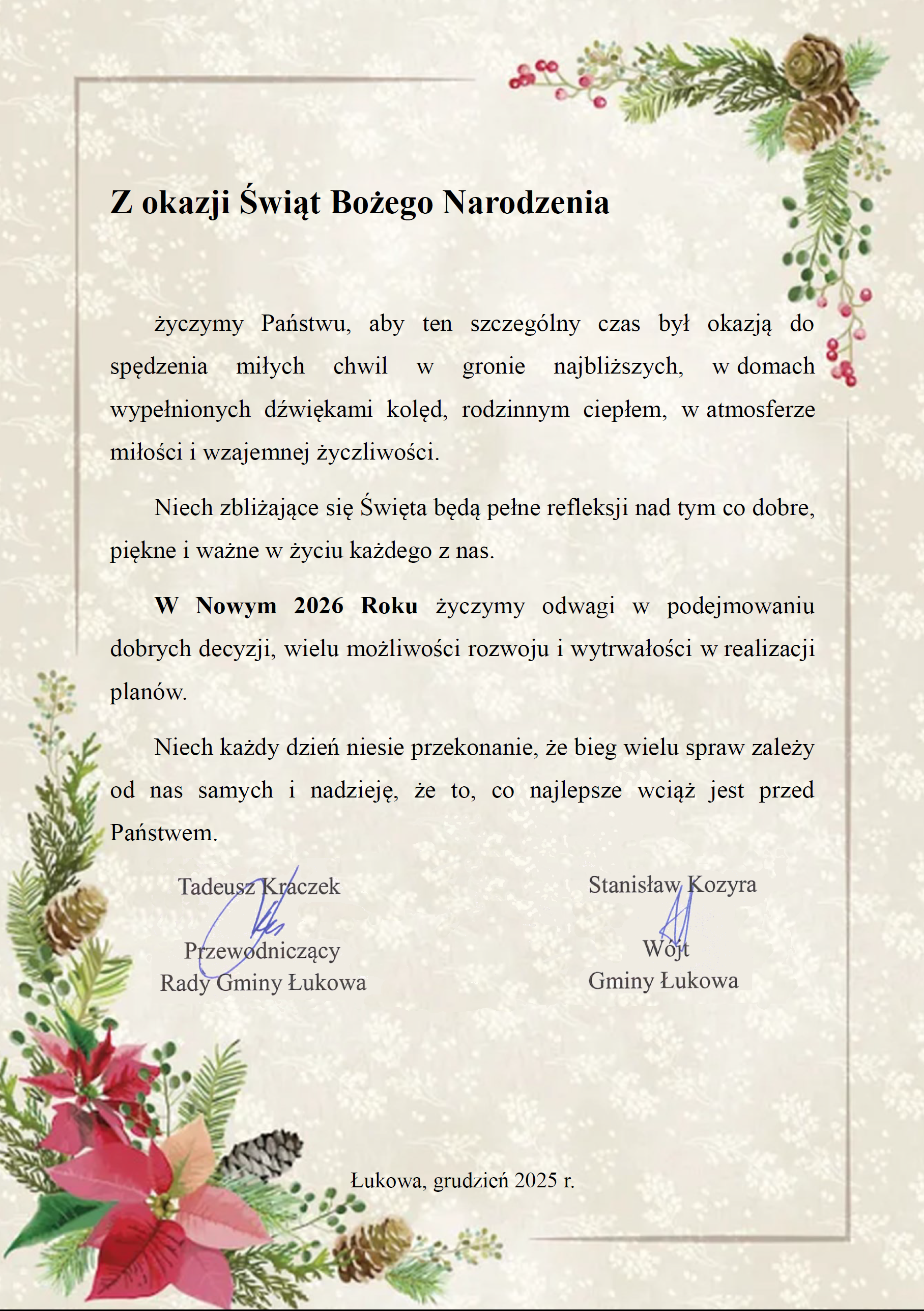 życzymy Państwu, aby ten szczególny czas był okazją do spędzenia miłych chwil w gronie najbliższych, w domach wypełnionych dźwiękami kolęd, rodzinnym ciepłem, w atmosferze miłości i wzajemnej życzliwości.