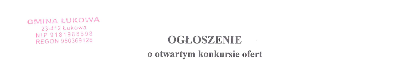 Wójt Gminy Łukowa ogłasza otwarty konkurs ofert: 1. W formie powierzenia wykonywania zadań publicznych wraz z udzieleniem dotacji na finansowanie ich realizacji w 2026 roku w zakresie: A) „Wspierania i upowszechniania kultury fizycznej”, polegającym na: - organizacji zawodów, imprez i festynów sportowo-rekreacyjnych, - organizacji turniejów sportowych oraz igrzysk młodzieżowych, - prowadzeniu zajęć sportowych, treningowych i szkoleniowych. B) „Profilaktyki i rozwiązywania problemów alkoholowych”, polegającym na: - organizacji zajęć sportowych jako alternatywnej formy spędzania czasu wolnego dla dzieci i młodzieży, - prowadzeniu działań profilaktycznych poprzez sport, promujących zdrowy styl życia wolny od alkoholu i innych substancji psychoaktywnych.