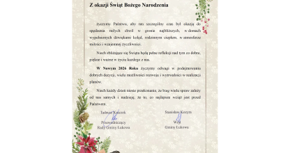 2025-12-22 Z okazji Świąt Bożego Narodzenia życzymy Państwu, aby ten szczególny czas był okazją do spędzenia miłych chwil w gronie najbliższych, w domach wypełnionych dźwiękami kolęd, rodzinnym ciepłem, w atmosferze miłości i wzajemnej życzliwości. Niech zbliżające się Święta będą pełne refleksji nad tym co dobre, piękne i ważne w życiu każdego z nas. W Nowym 2026 Roku życzymy odwagi w podejmowaniu dobrych decyzji, wielu możliwości rozwoju i wytrwałości w realizacji planów. Niech każdy dzień niesie przekonanie, że bieg wielu spraw zależy od nas samych i nadzieję, że to, co najlepsze wciąż jest przed Państwem. Przewodniczący Rady Gminy Łukowa Tadeusz Kraczek oraz Wójt Gminy Łukowa Stanisław Kozyra